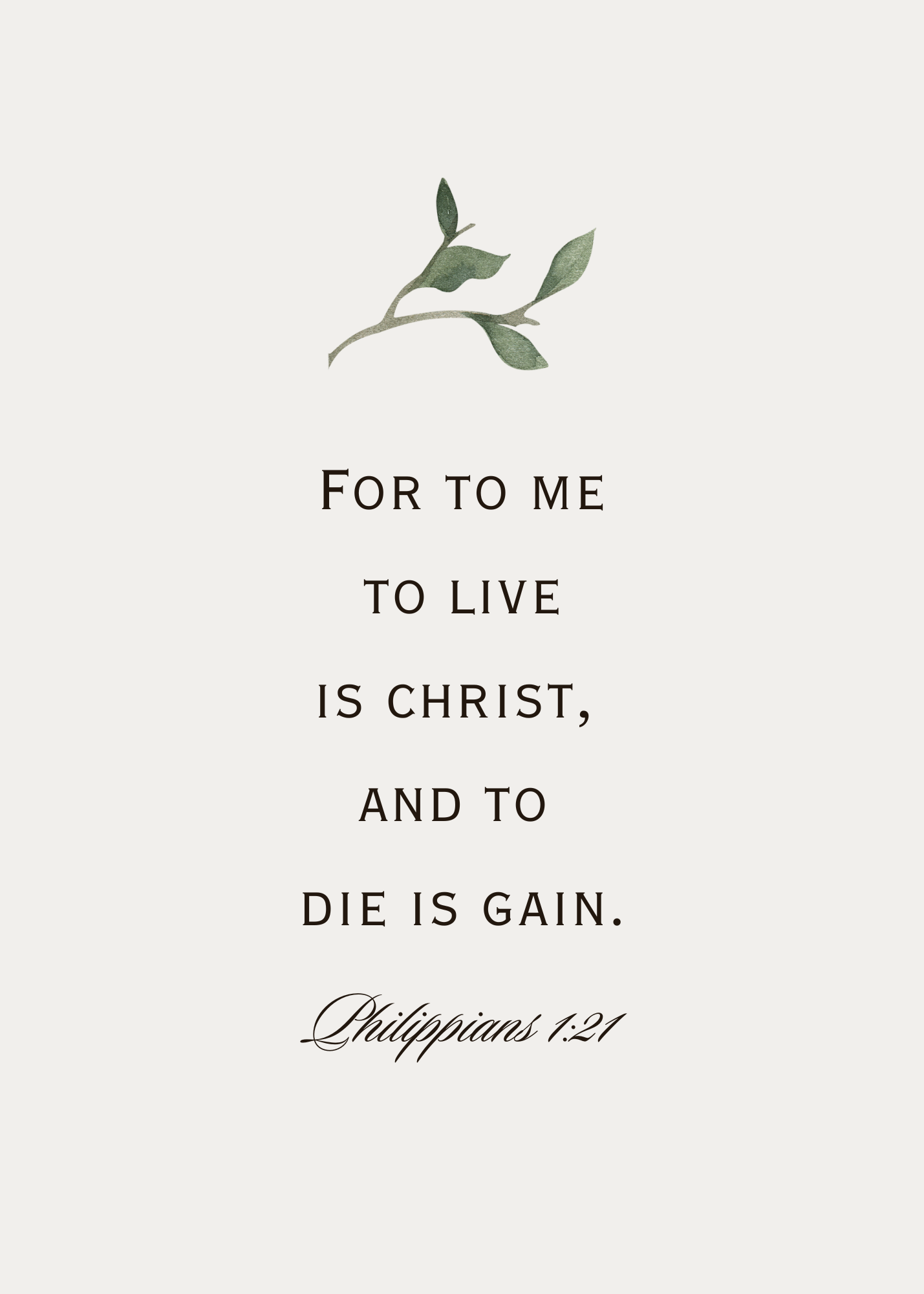 What does Philippians 1:21 mean? What does “For to me to live is Christ, and to die is gain.” mean? Not just a pat answer that simplifies the verse into a list of right and wrong. Here is a FREE Printable of Philippians 1:21 to help.
